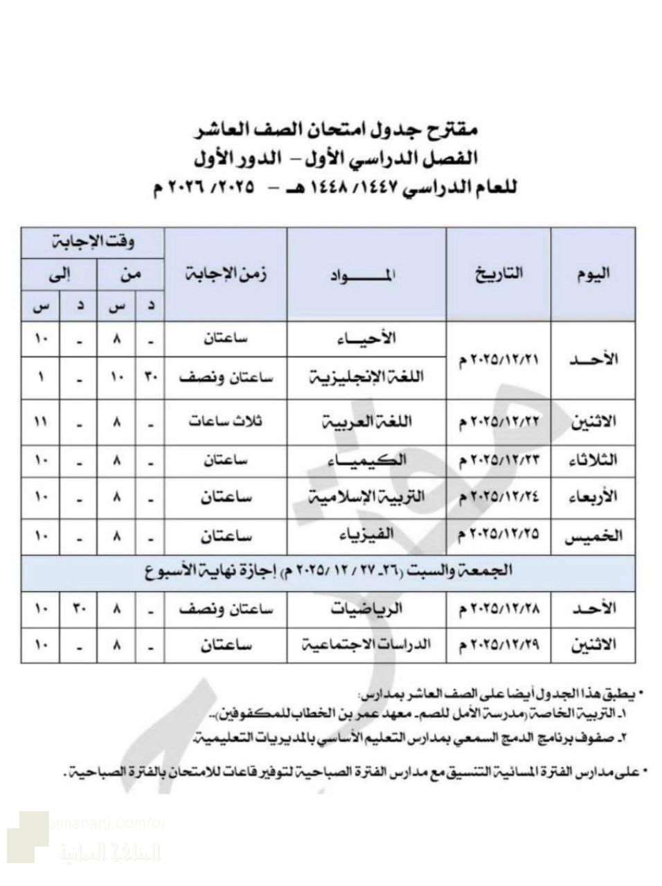 6. الصف العاشر, الامتحانات, مقترح جدول امتحان الصف العاشر الفصل الدراسي الأول الدور الأول