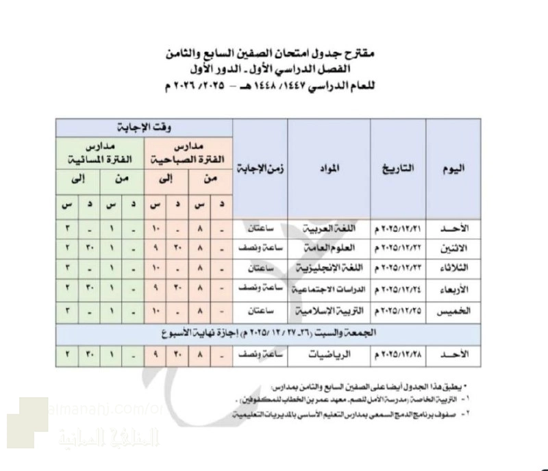 1. مرحلة إعدادية, الامتحانات, مقترح جدول امتحان الصفين السابع والثامن الفصل الدراسي الأول الدور الأول