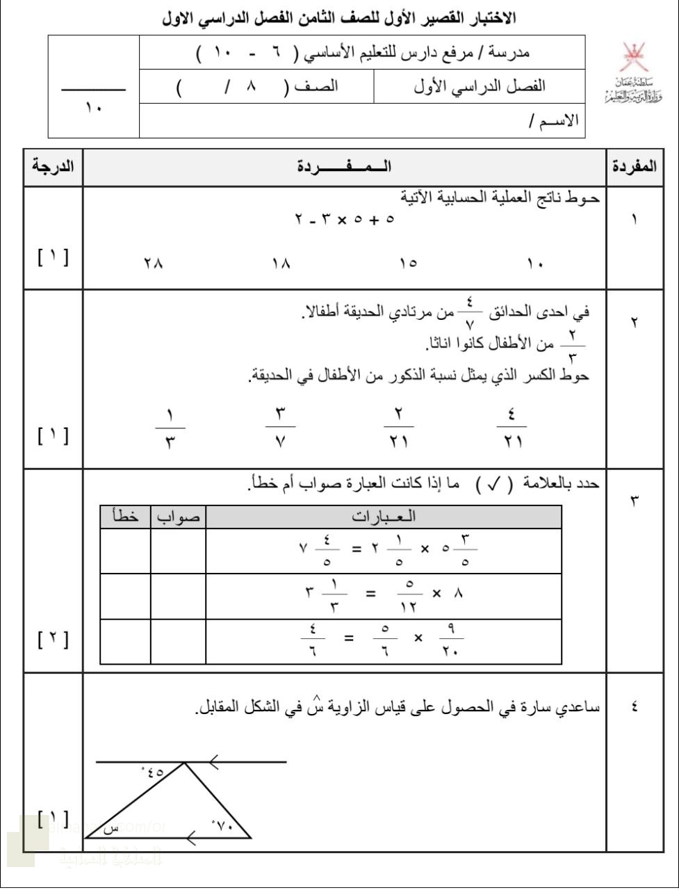 أنت هنا: موقع المناهجالمناهج العمانية الصف الثامن رياضيات الفصل الأول اختبارات