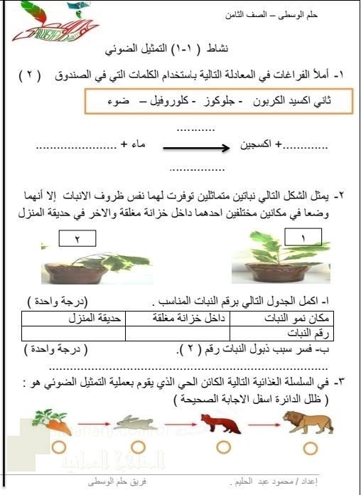 5. الصف الثامن, علوم, نشاط الدرس الأول (التمثيل الضوئي)