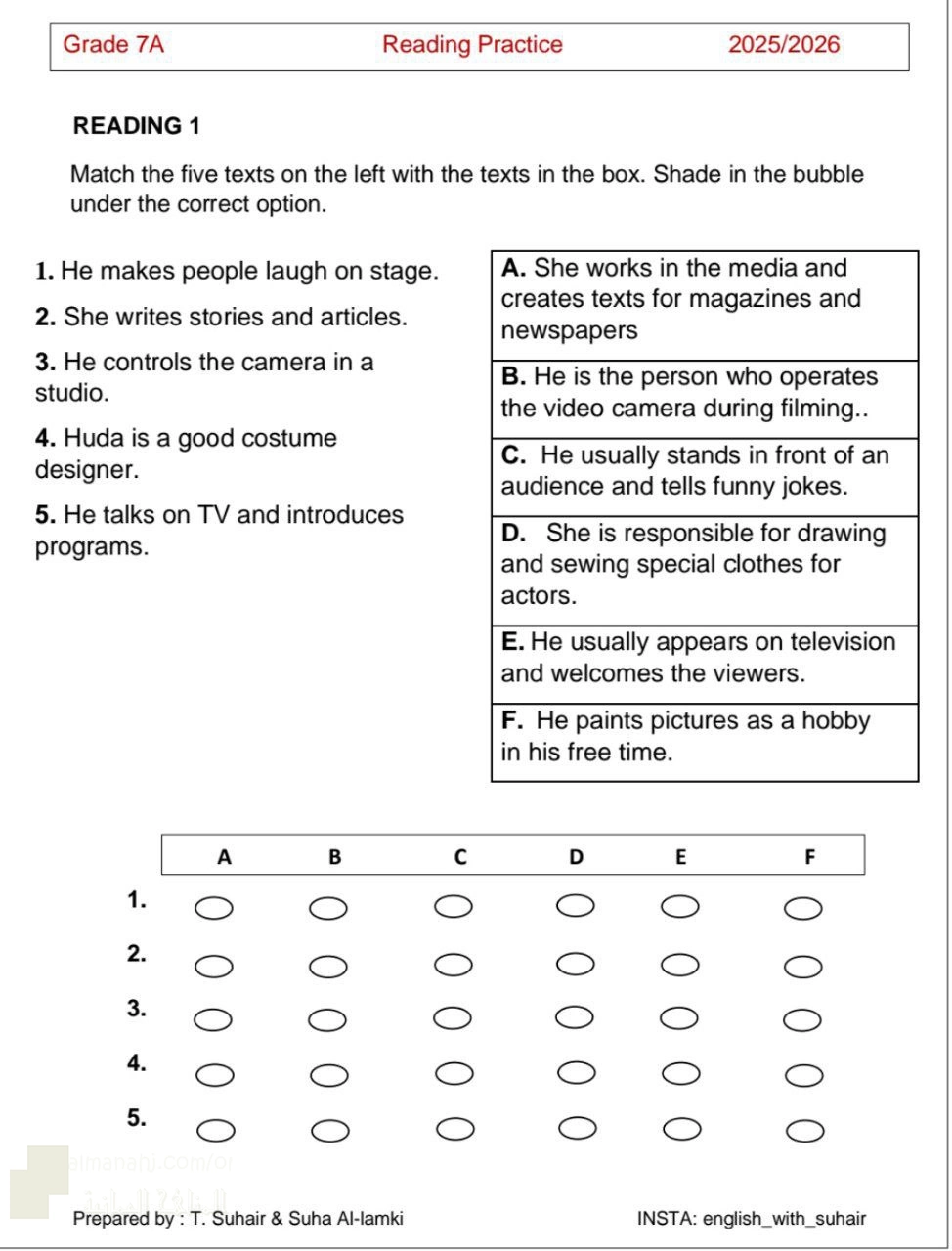 9. الصف السابع, لغة انجليزية, اختبار القراءة Reading Quiz