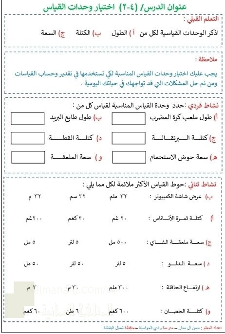 9. الصف السابع, رياضيات, ملخص الوحدة الرابعة الطول والكتلة والسعة