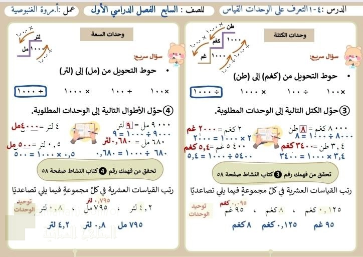 9. الصف السابع, رياضيات, ملخص الوحدة الرابعة الطول والكتلة والسعة