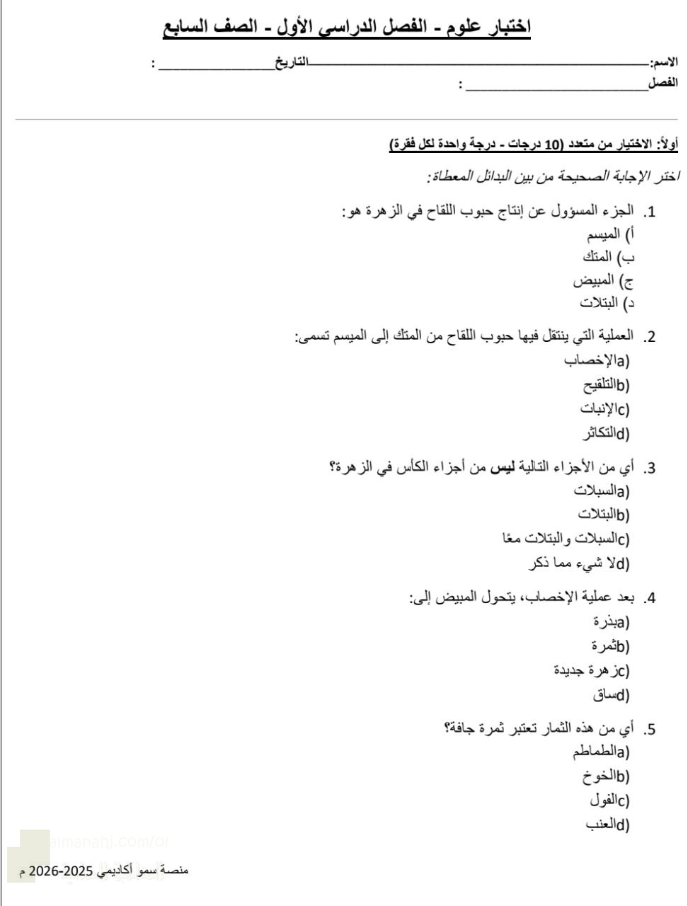 3. الصف السابع, علوم, اختبار قصير أول مرفق بالإجابات في وحدة النبات