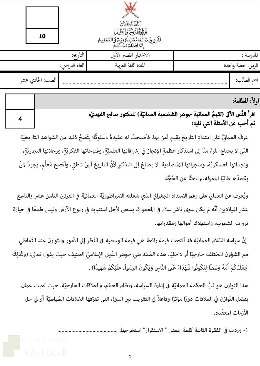 7. الصف الحادي عشر, لغة عربية, اختبار قصير أول مع نموذج الإجابة في محافظة مسندم