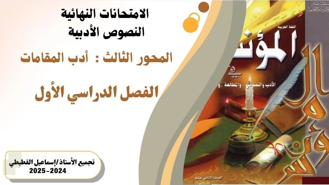 1. الصف الثاني عشر, لغة عربية, تجميع امتحانات نهائية سابقة مع نماذج الإجابة في النصوص الأدبية للمحور الثالث أدب المقامات