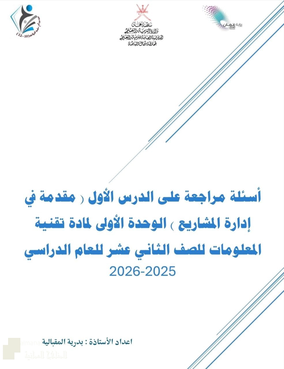 أسئلة مراجعة على الدرس الأول (مقدمة في إدارة المشاريع) من الوحدة الأولى - إعداد: المدرسة بدرية المقبالية