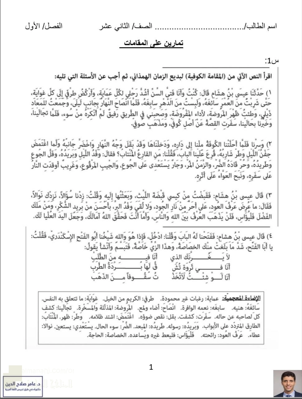 13. الصف الثاني عشر, لغة عربية, تمارين على المقامات