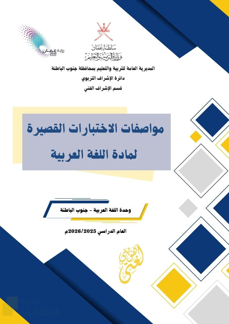 15. الصف الثاني عشر, لغة عربية, مواصفات الاختبارات القصيرة محافظة جنوب الباطنة