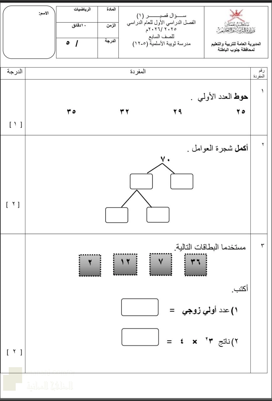 5. رياضيات, الفصل الأول, 2025/2026, سؤال قصير أول محافظة جنوب الباطنة