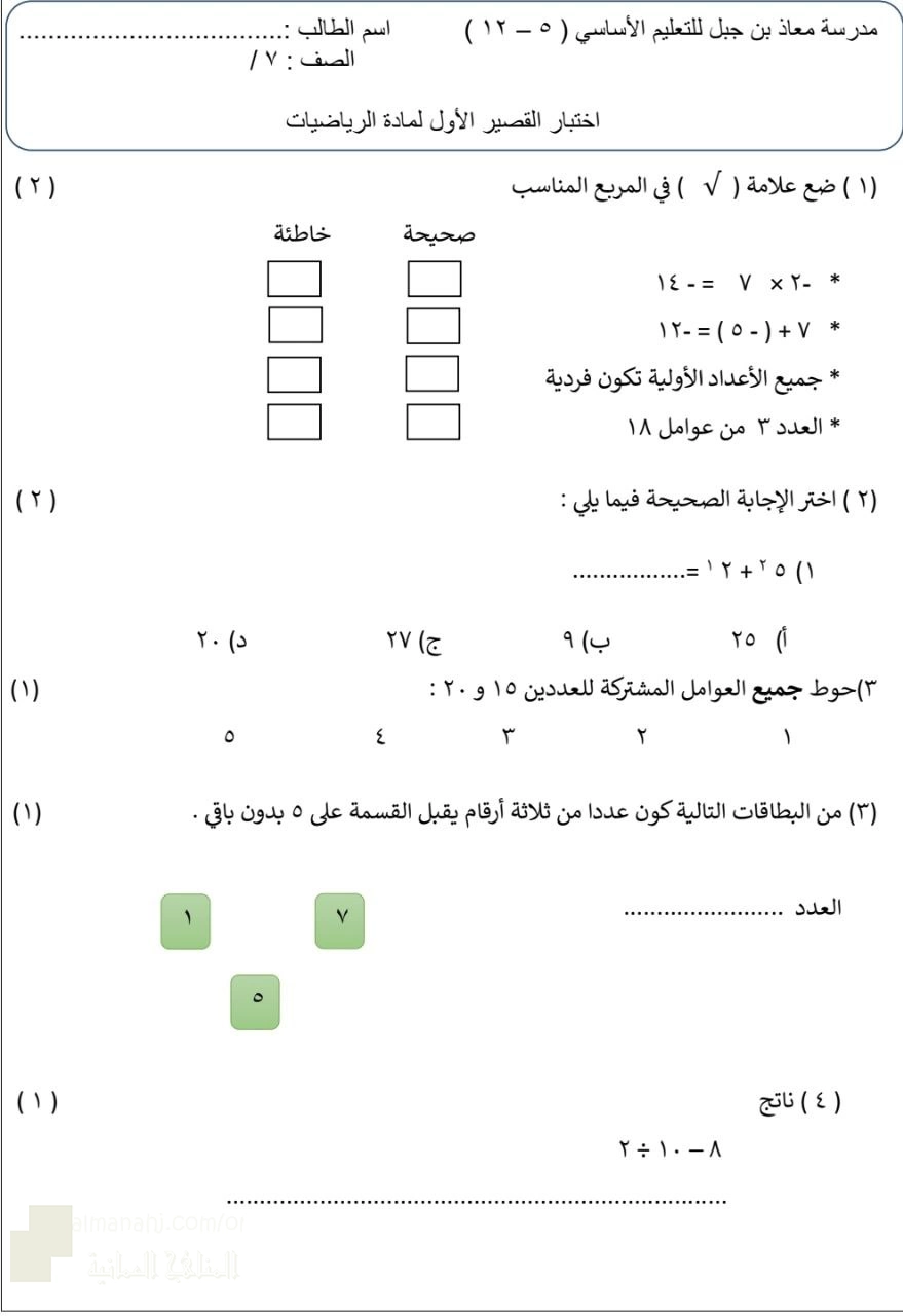 3. الصف السابع, رياضيات, أسئلة الاختبار القصير الأول بدون حل