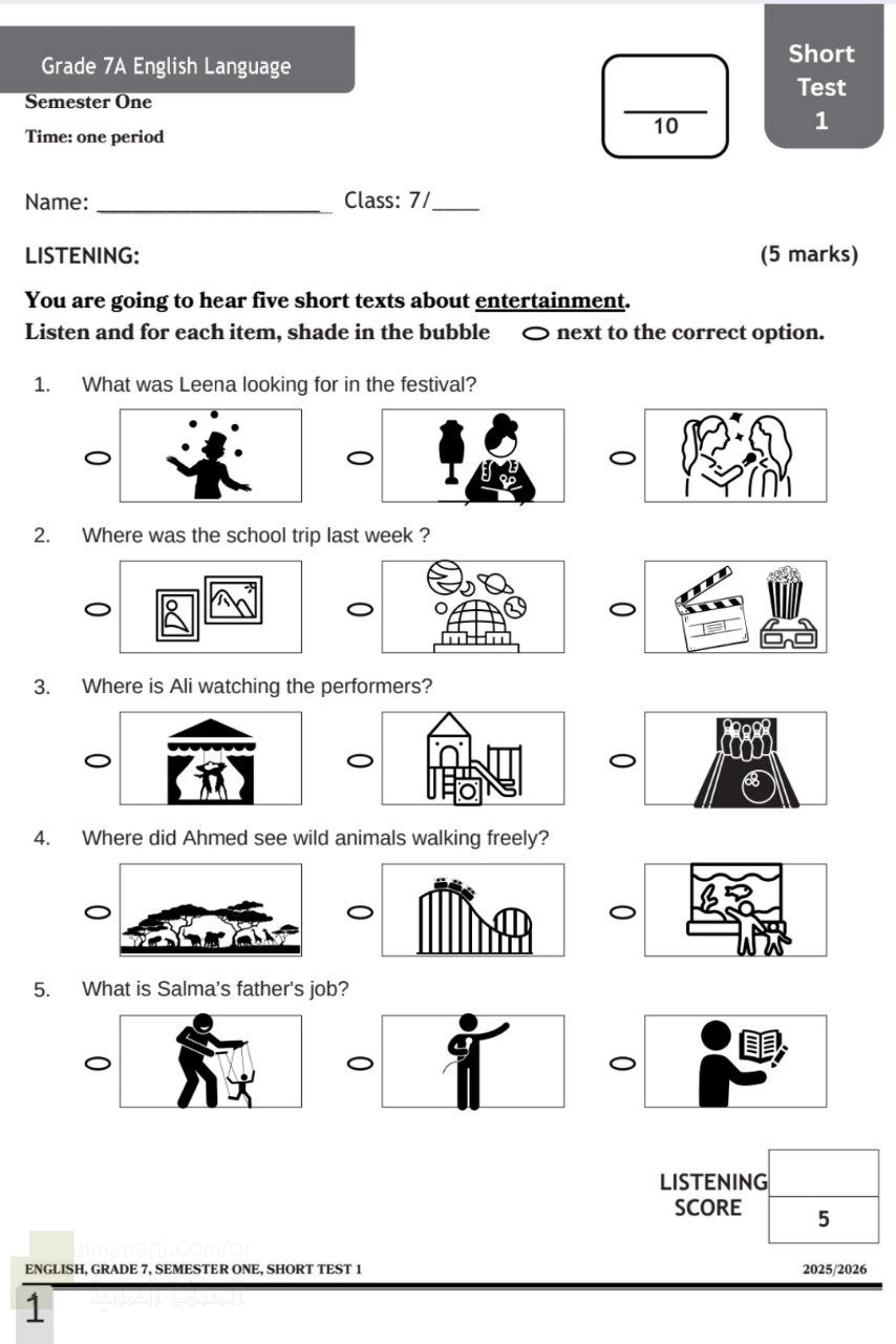 معلومات الملف: أسئلة اختبار قصير أول نموذج ثالث بدون حل ويشمل أسئلة في مهاراتي الاستماع و القراءة من مادة اللغة الإنجليزية للصف السابع الفصل الدراسي الأول