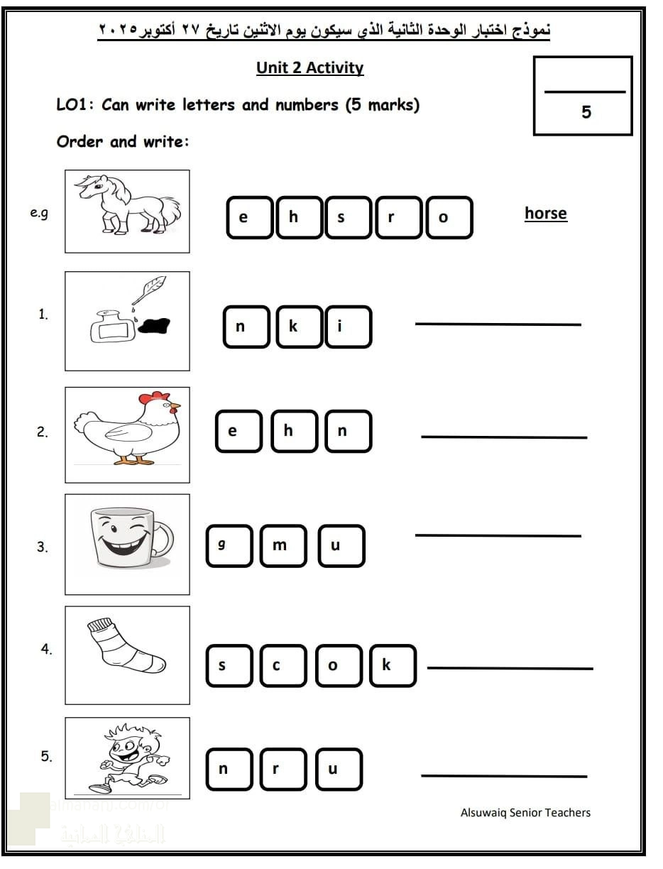 9. الصف الثاني, لغة انجليزية, اختبار الوحدة الثانية Unit 2 Activity