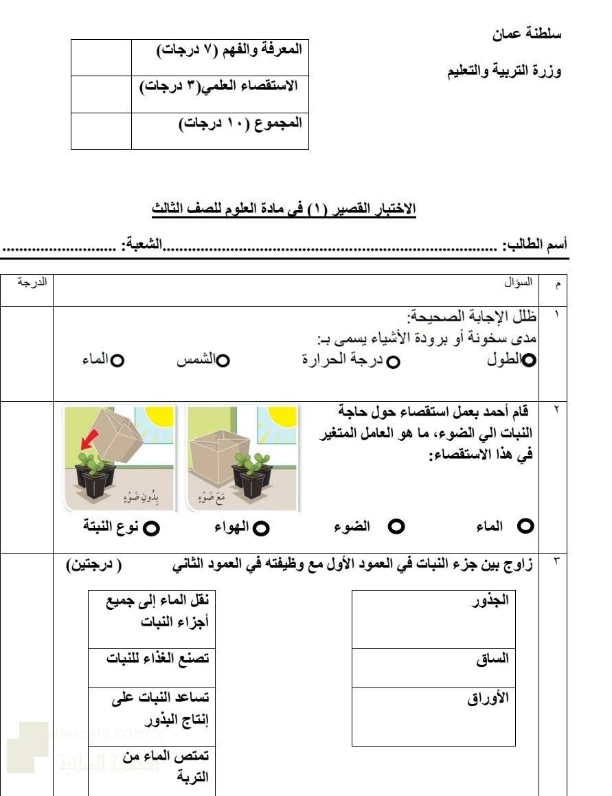 3. الصف الثالث, علوم, أسئلة اختبار قصير أول بدون حلول
