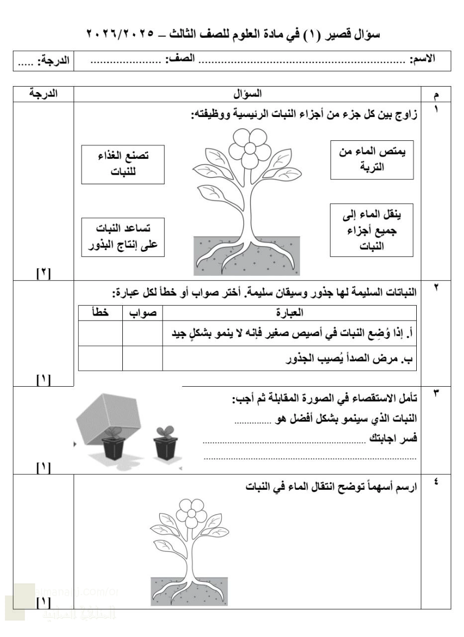 3. علوم, الفصل الأول, 2025/2026, أسئلة اختبار قصير أول بدون حلول