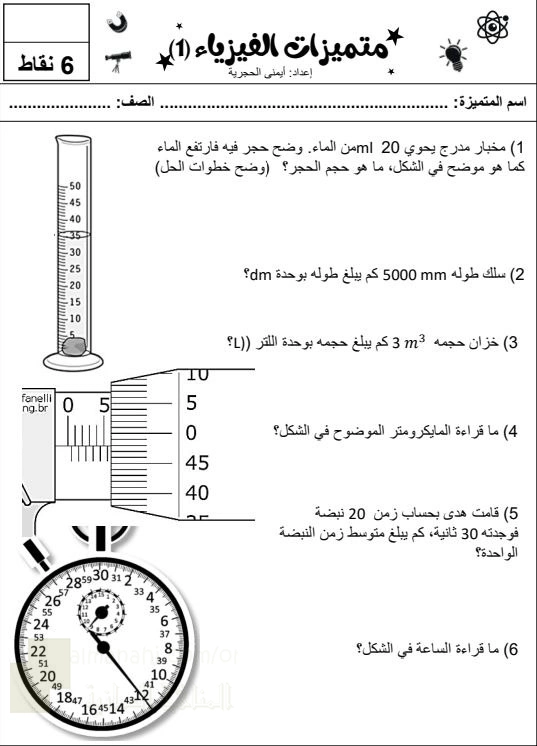 5. الصف التاسع, فيزياء, أسئلة وإجابات أسئلة اختبار متميزات الفيزياء