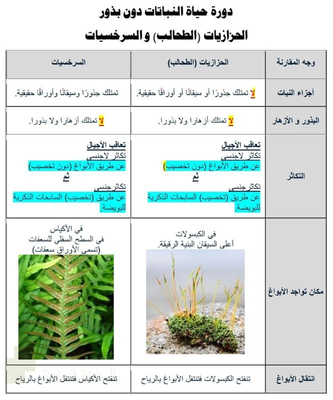 تم إيجاد الملف: جداول مقارنة دورة حياة الحزازيات والسرخسيات