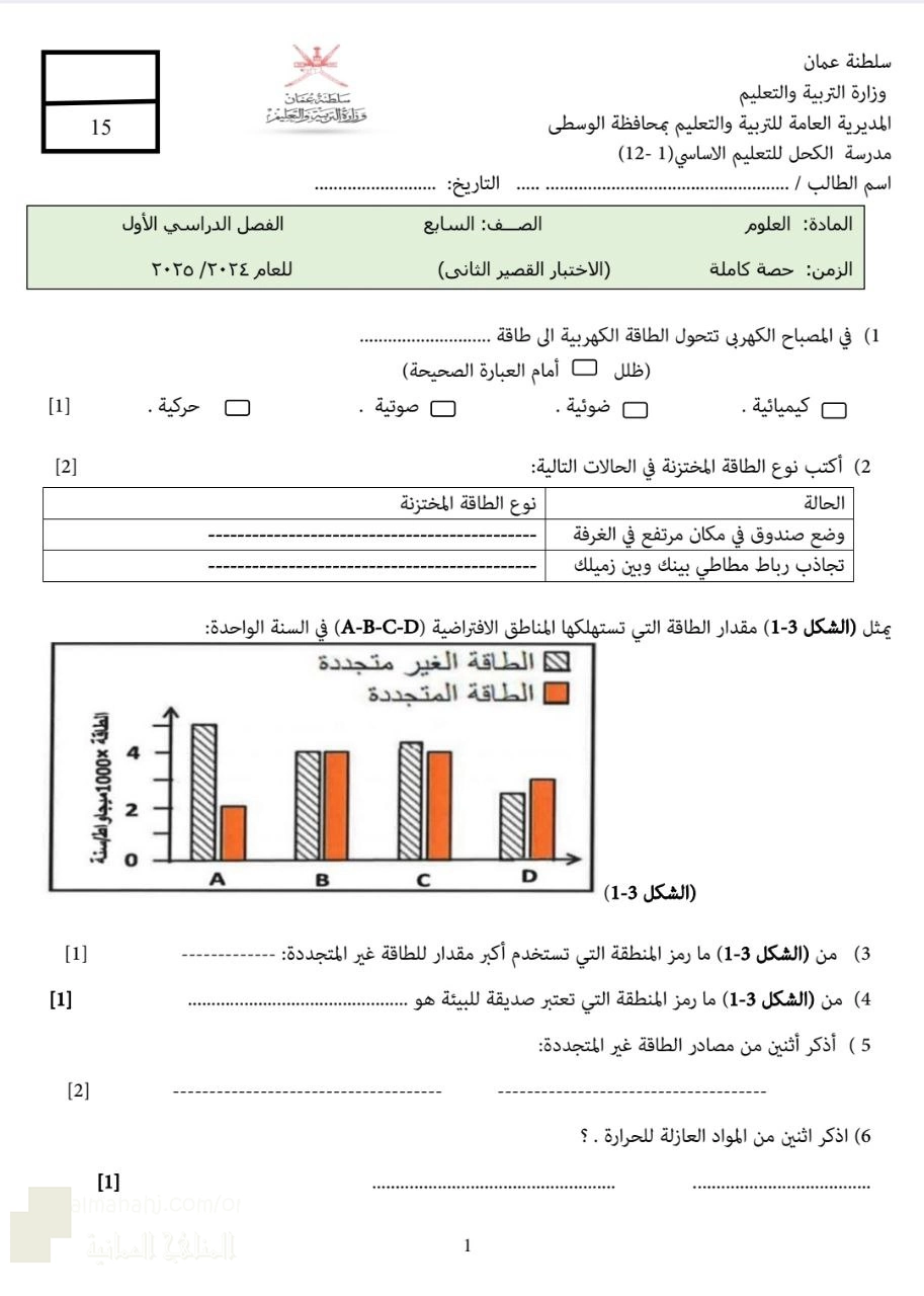 12. الصف السابع, علوم, اختبار قصير ثاني في الوحدة الثالثة الطاقة بمحافظة الوسطى