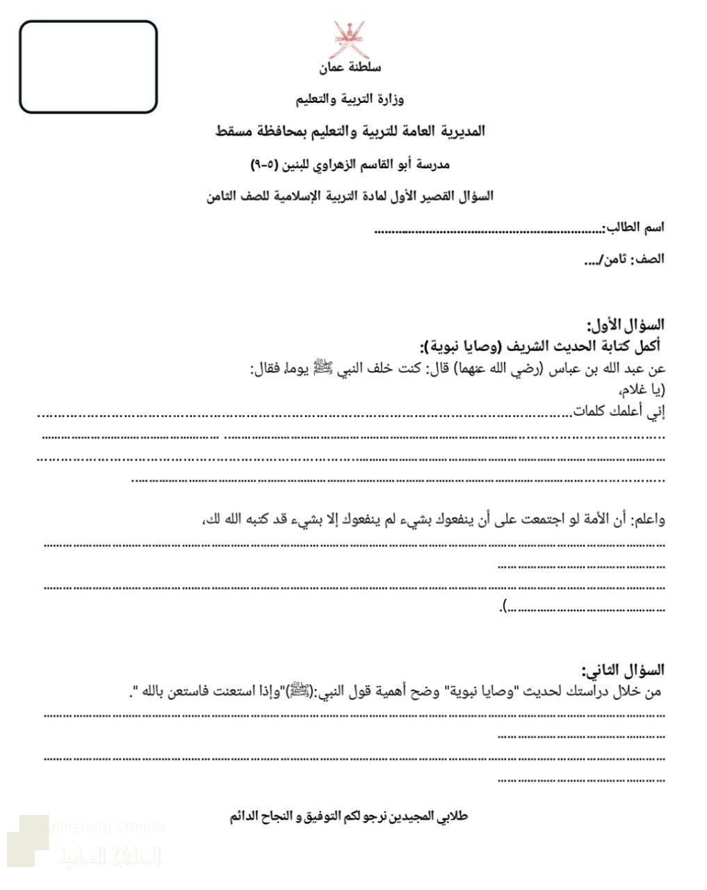 تم إيجاد الملف: السؤال القصير الأول لدرس الحديث الشريف (وصايا نبوية) بمحافظة مسقط