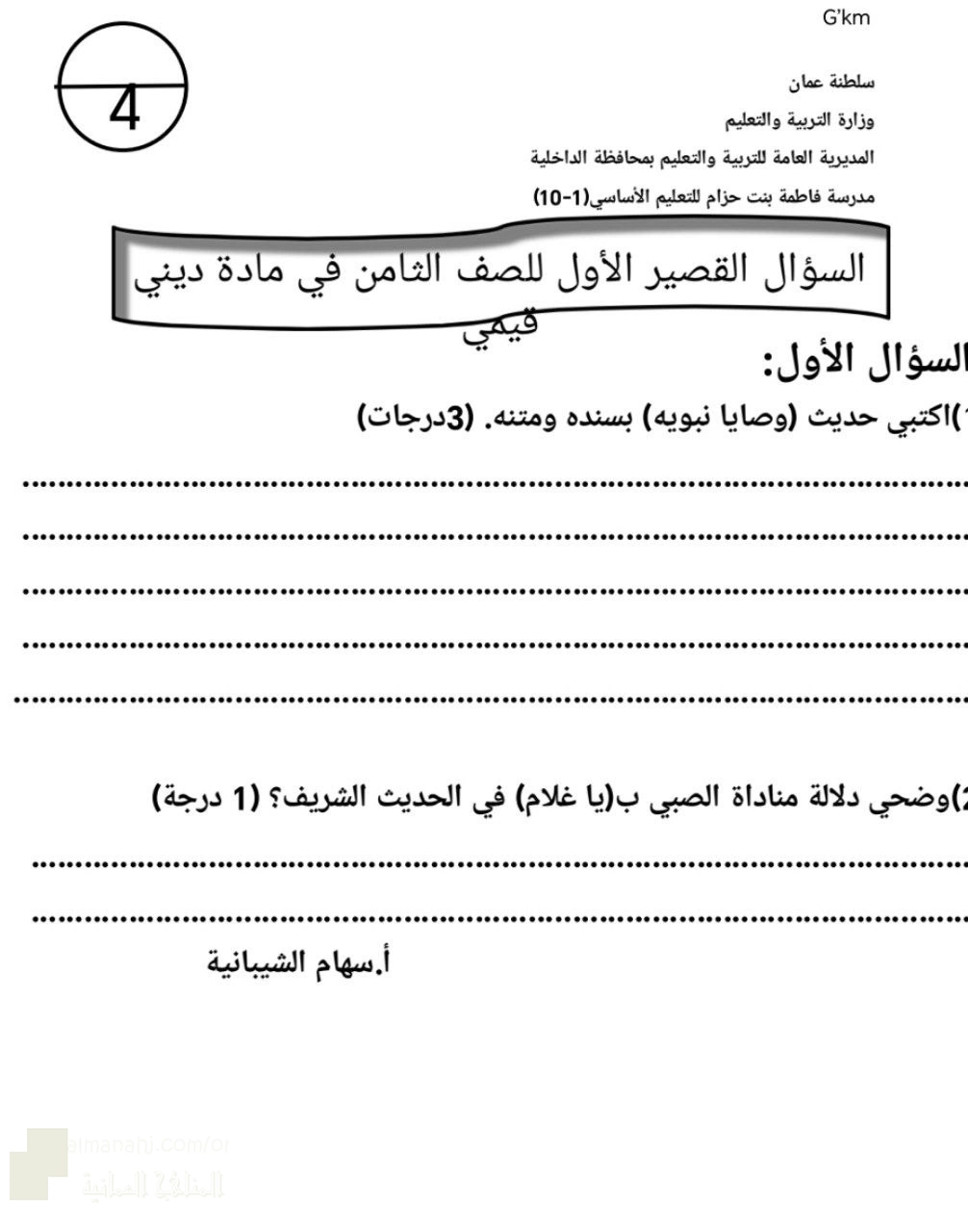 3. السؤال القصير الأول لدرس الحديث الشريف (وصايا نبوية) بمحافظة مسقط