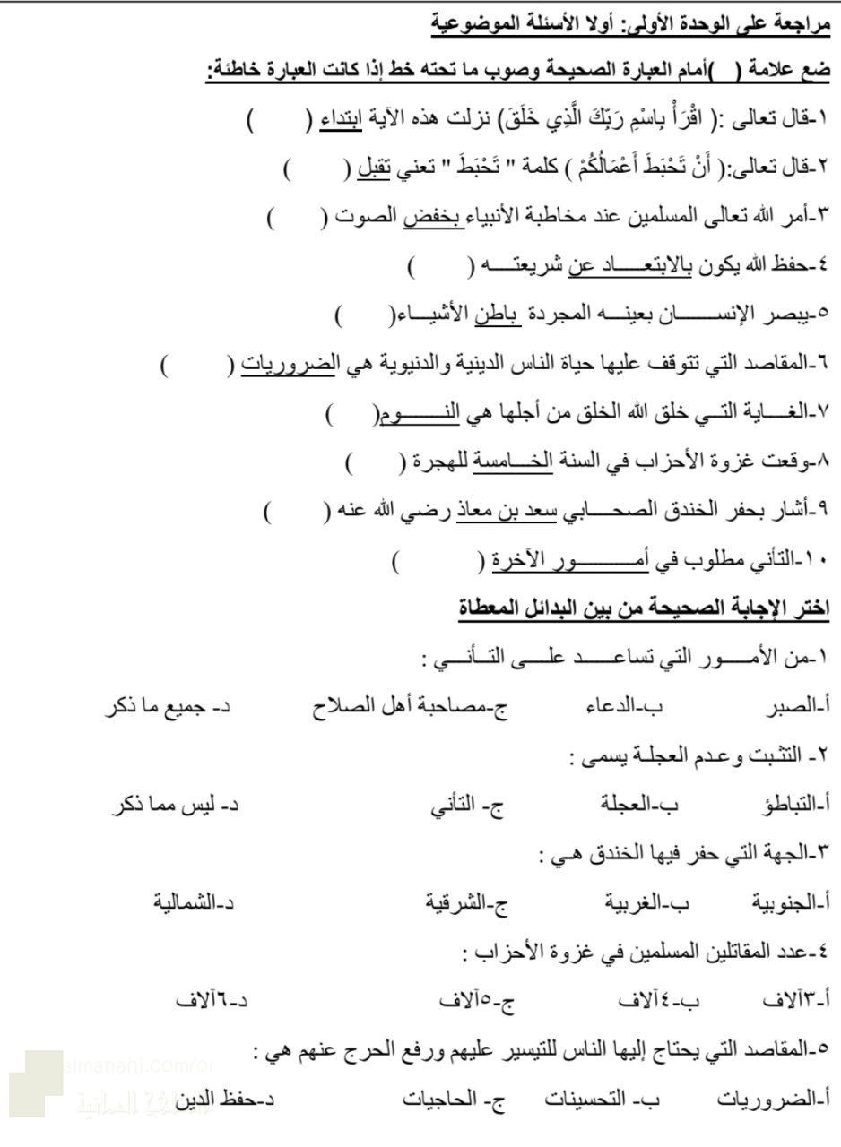 1. تربية اسلامية, الفصل الأول, 2025/2026, أسئلة مراجعة لدروس الوحدة الأولى