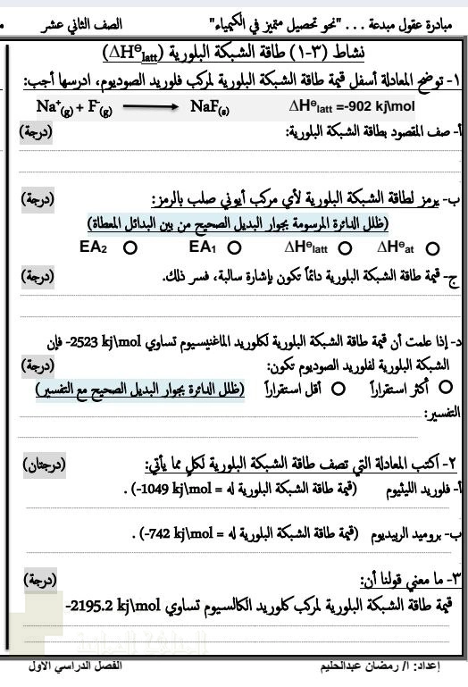 6. الصف الثاني عشر, كيمياء, أنشطة دروس الوحدة الثالثة مع نماذج الإجابة من مبادرة عقول مبدعة