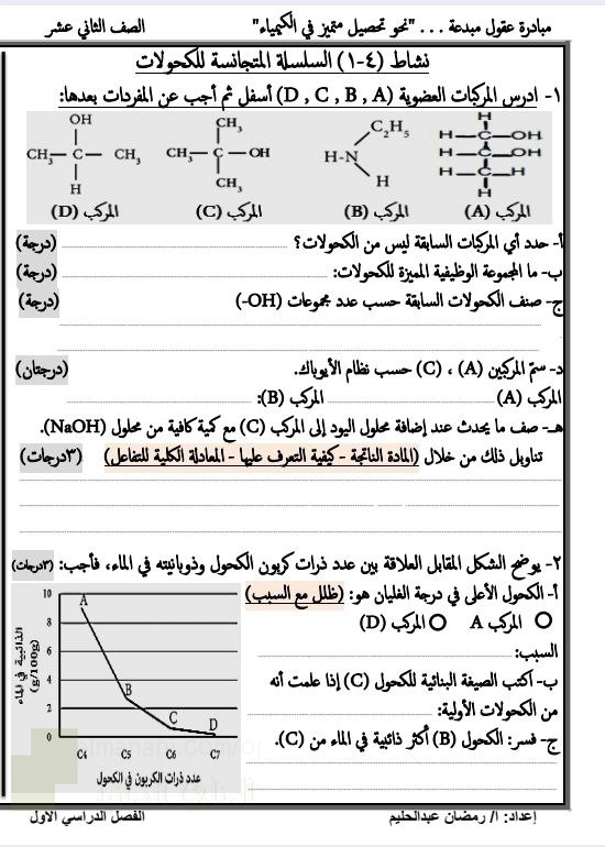 معلومات الملف: أعزائي الطلبة نقدم لكم ملف يتضمن أنشطة دروس الوحدة الرابعة مع نماذج الإجابة من مبادرة عقول مبدعة للصف الثاني عشر مادة الكيمياء الفصل الدراسي الأول