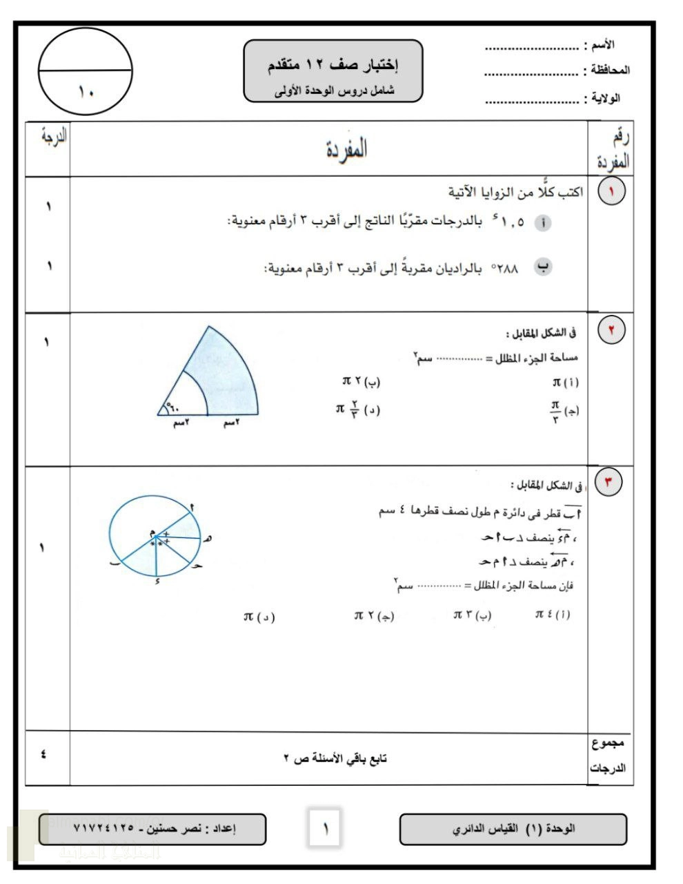 1. الصف الثاني عشر, رياضيات متقدمة, نموذج اختبار قصير أول شامل دروس الوحدة الأولى (القياس الدائري)