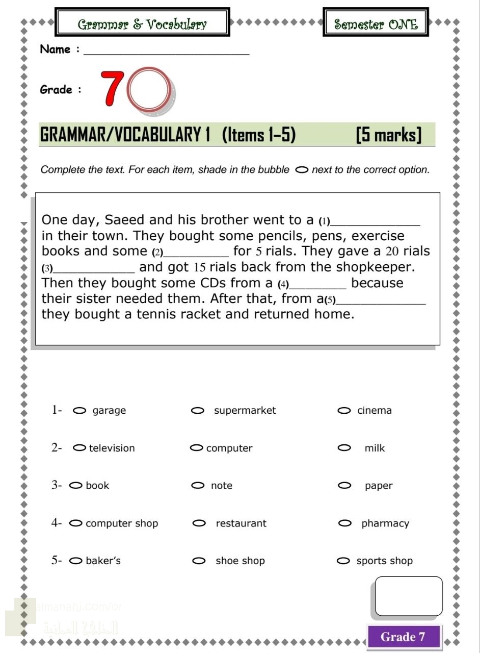 معلومات الملف: أعزائي الطلبة نقدم لكم ملف يتضمن اختبارات قصيرة في القواعد و الكلمات Grammar and vocabulary من مادة اللغة الإنجليزية للصف السابع الفصل الدراسي الأول