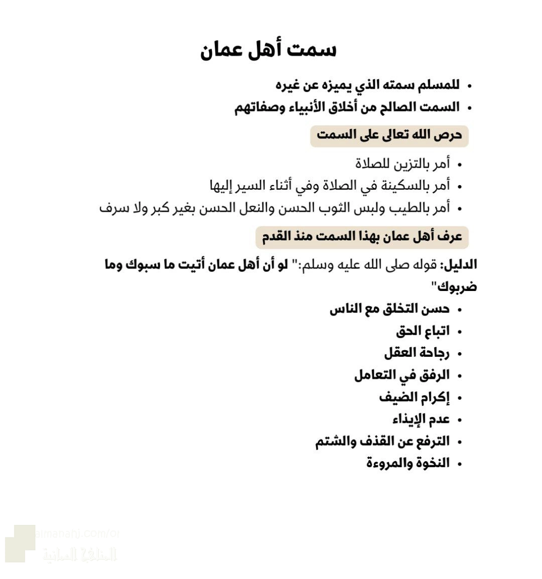 14. الصف التاسع, تربية اسلامية, ملخص مبسط لدرس سمت أهل عمان