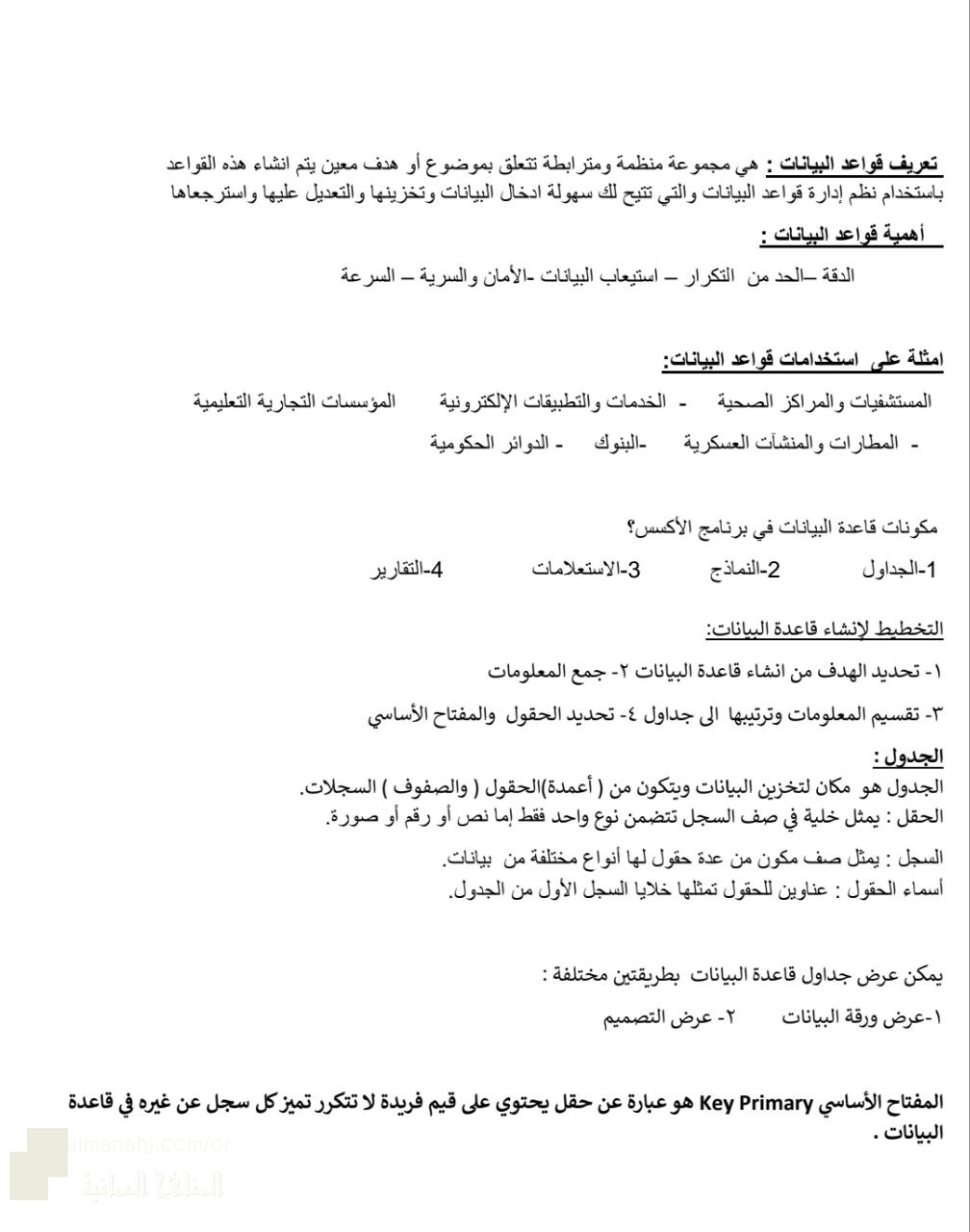 11. الصف التاسع, حاسوب, ملخص مبسط لدرس قواعد البيانات