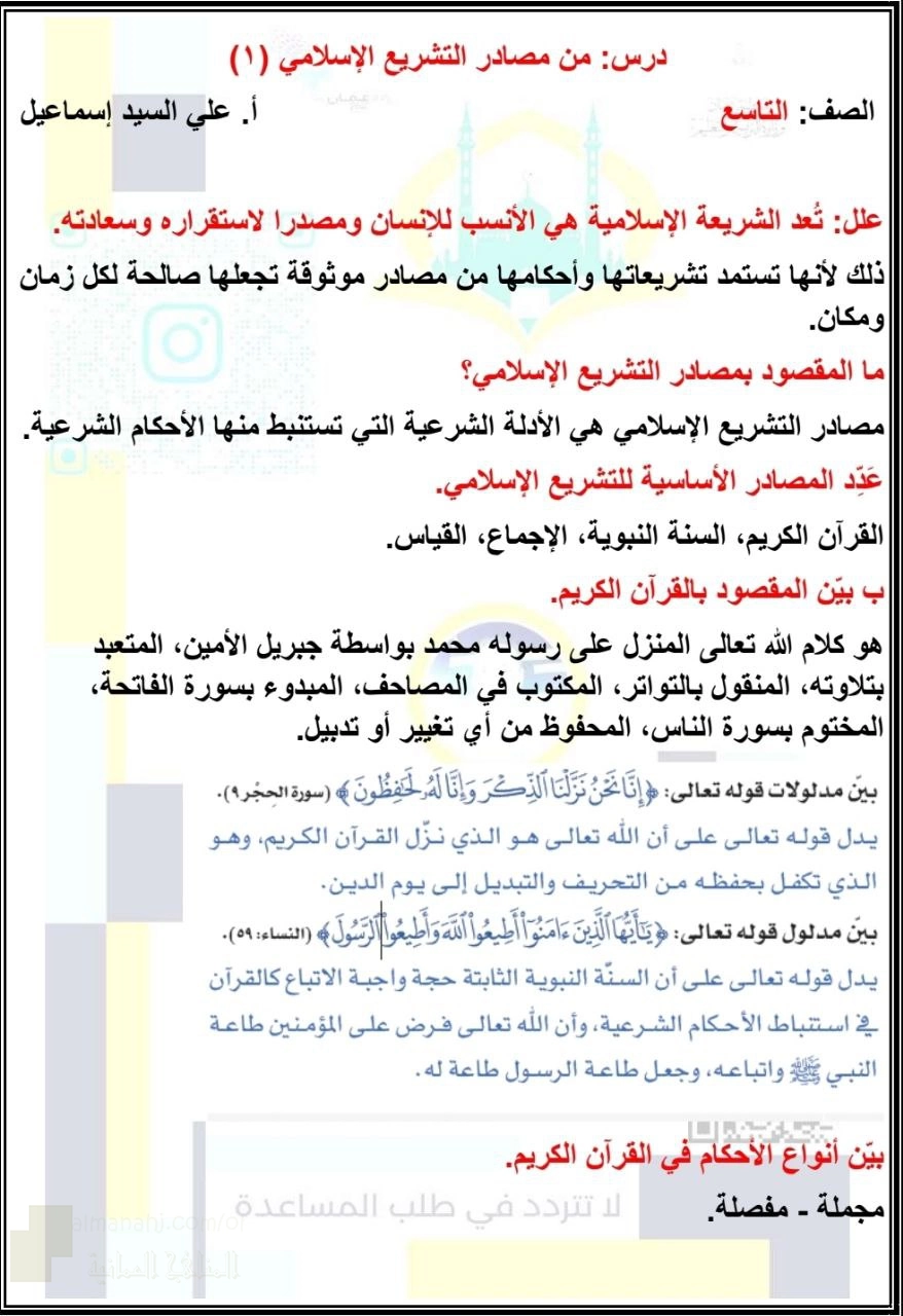8. الصف التاسع, تربية اسلامية, ملخص شرح درس من مصادر التشريع الإسلامي (1)