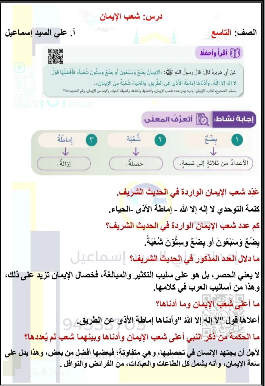 7. الصف التاسع, تربية اسلامية, ملخص شرح درس شعب الإيمان