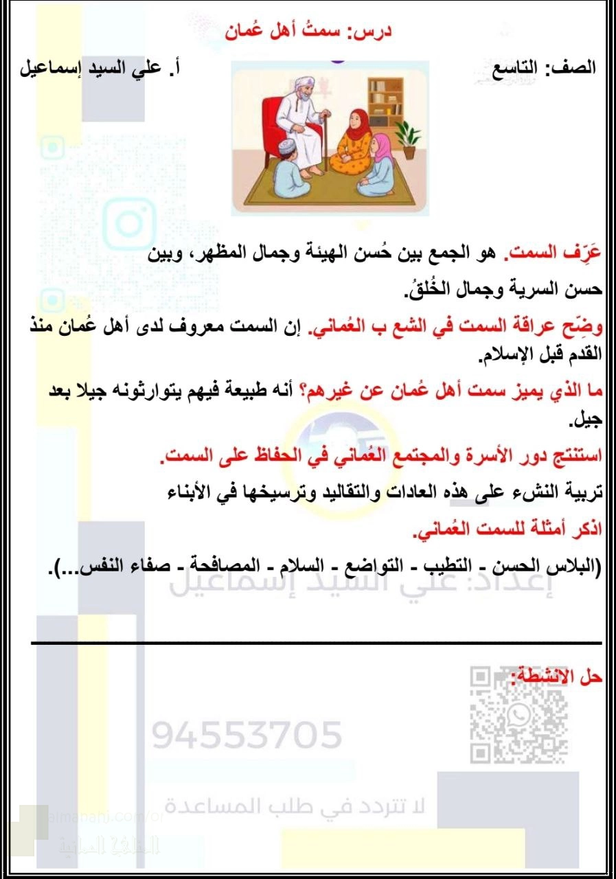 معلومات الملف: أعزائي الطلبة نقدم لكم ملف يتضمن ملخص شرح درس سمت أهل عمان بطريقة سؤال و جواب مع حل الأنشطة من مادة التربية الإسلامية للصف التاسع الفصل الدراسي الأول