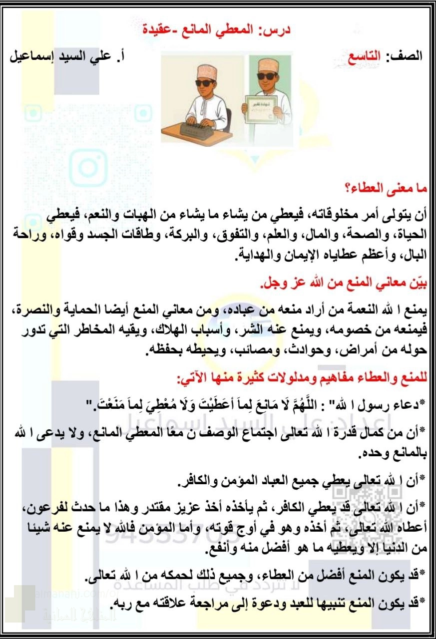 5. تربية اسلامية, الفصل الأول, 2025/2026, ملخص درس المعطي المانع بطريقة سؤال وجواب