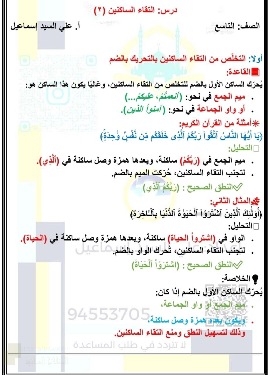 3. الصف التاسع, تربية اسلامية, ملخص شرح درس التجويد التقاء الساكنين (١)