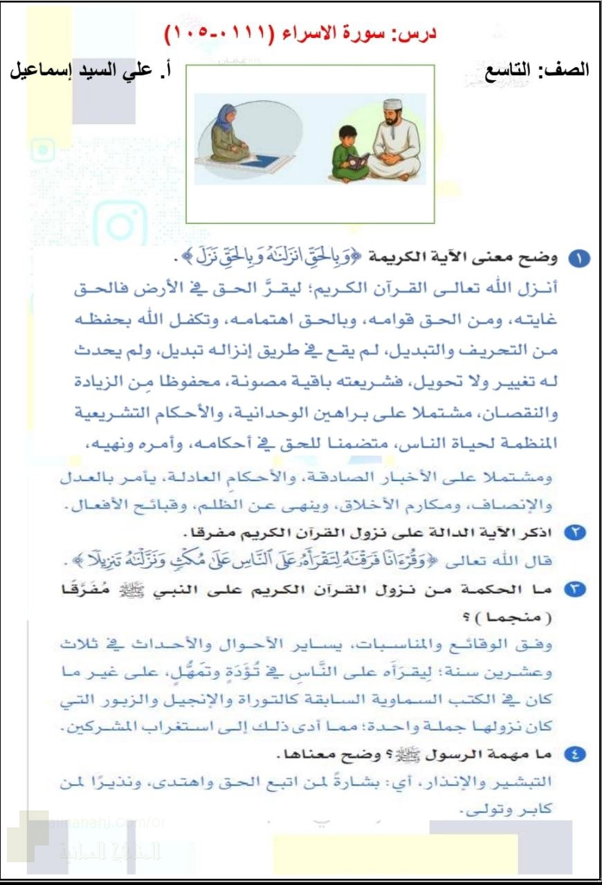 9. الصف التاسع, تربية اسلامية, ملخص درس سورة الإسراء (١١١ - ١٠٥)