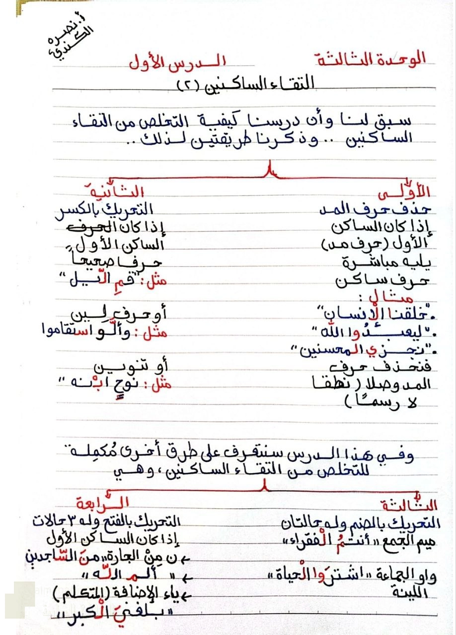 4. الصف التاسع, تربية اسلامية, ملخص درس التجويد التقاء الساكنين (٢) بخط اليد