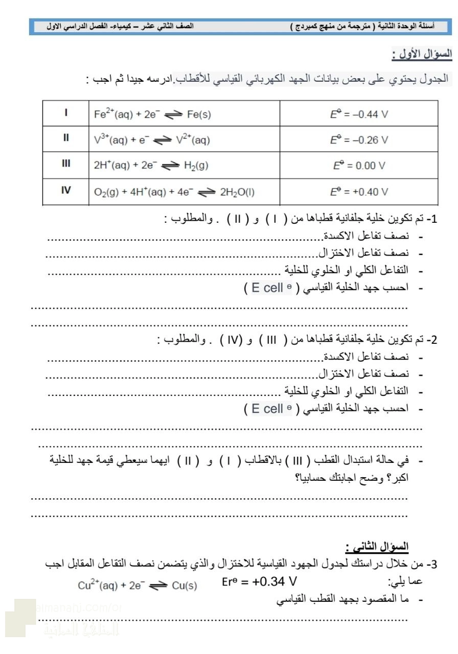 14. الصف الثاني عشر, كيمياء, مذكرة أسئلة في الكيمياء الكهربائية
