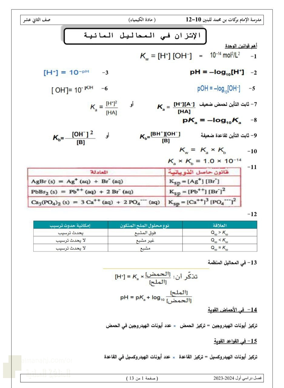 مراجعة الوحدة الأولى الإتزان في المحاليل المائية, مدرسة الإمام بركات بن محمد, الصف الثاني عشر, كيمياء, الفصل الأول, 2025/2026 - المناهج العمانية