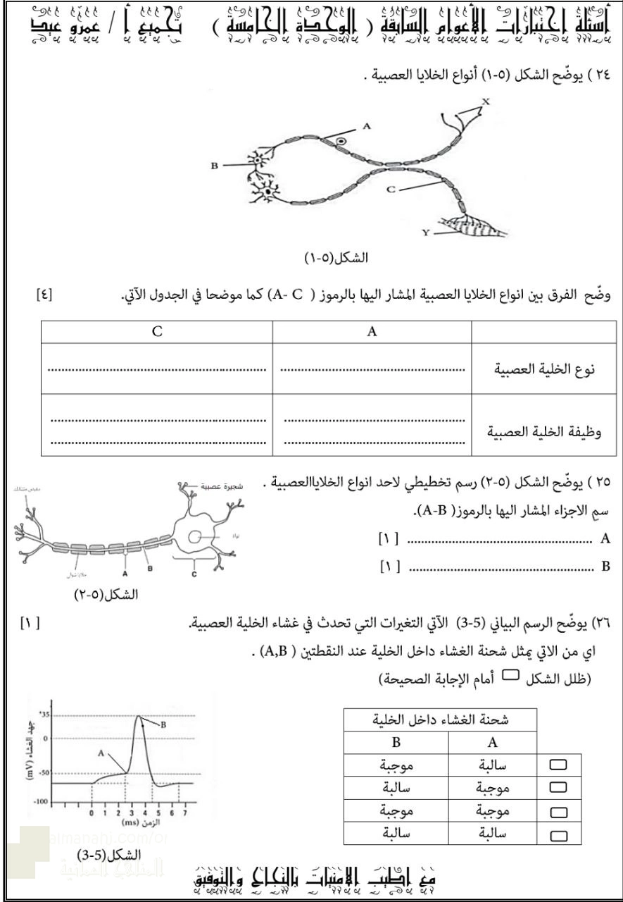 7. الصف الثاني عشر, أحياء, تجميع أسئلة اختبارات سابقة على الوحدة الخامسة التحكم والتنسيق مرفقة بنماذج الإجابة
