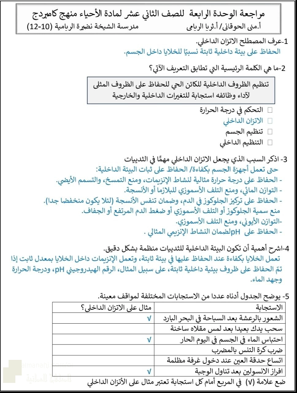 5. الصف الثاني عشر, أحياء, مراجعة الوحدة الرابعة الاتزان الداخلي بطريقة سؤال وجواب من منهج كامبريدج