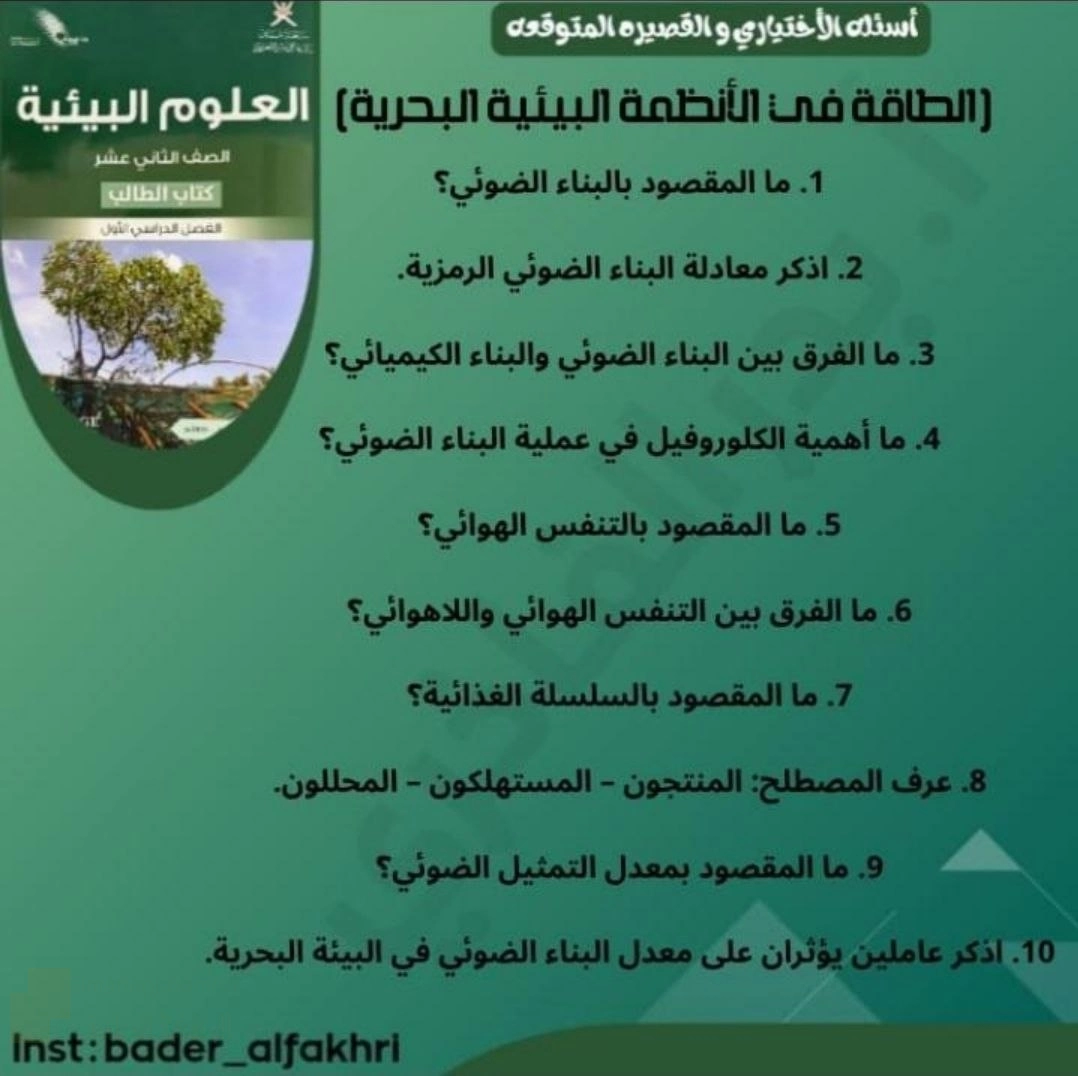 الأسئلة المتوقعة للامتحان, الصف الثاني عشر, علوم بيئية, الفصل الأول, 2025/2026 - المناهج العمانية