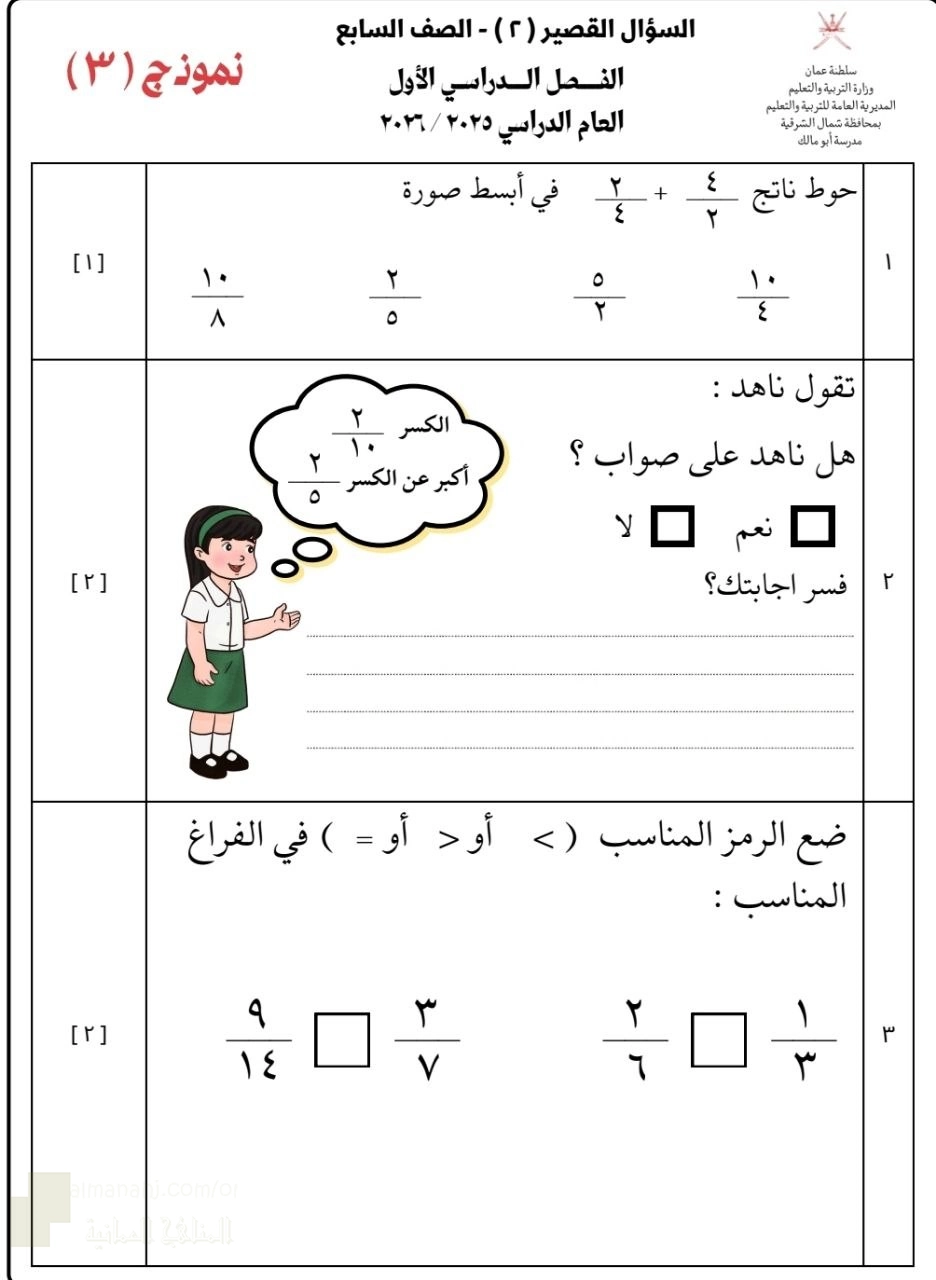 3. الصف السابع, رياضيات, أسئلة وإجابات الاختبار القصير الثاني نموذج (١)