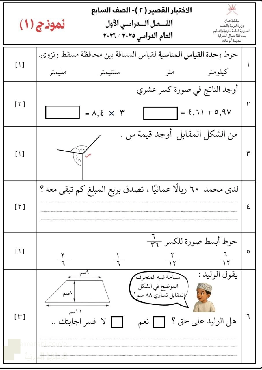 أسئلة وإجابات الاختبار القصير الثاني نموذج (١), مدرسة أبو مالك, الصف السابع, رياضيات, الفصل الأول, 2025/2026 - المناهج العمانية