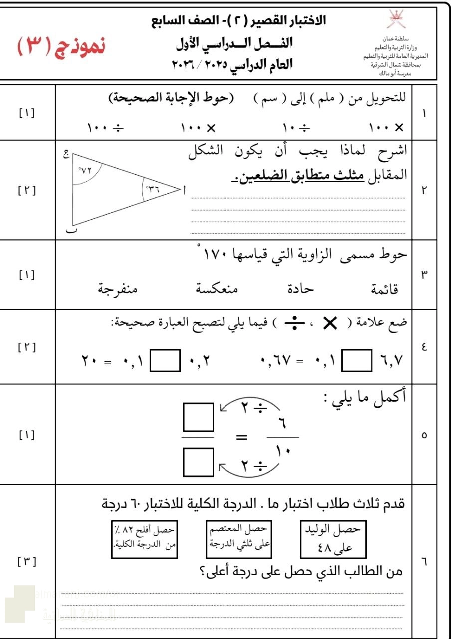 أسئلة وإجابات الاختبار القصير الثاني نموذج (٣), مدرسة أبو مالك, الصف السابع, رياضيات, الفصل الأول, 2025/2026 - المناهج العمانية