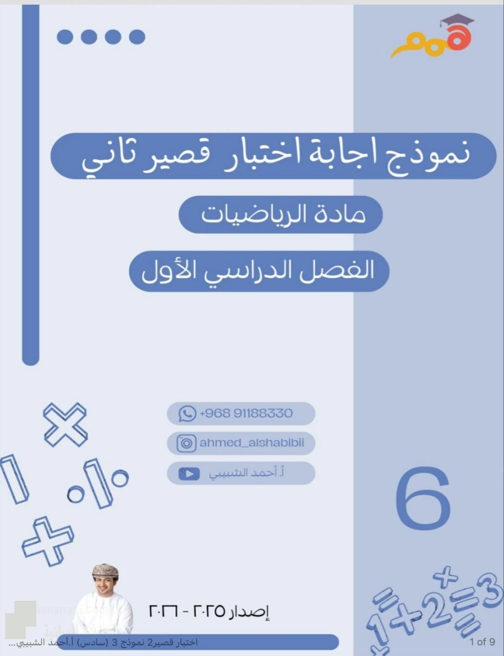 معلومات الملف: أعزائي الطلبة نقدم لكم ملف يتضمن إجابات أسئلة الاختبار القصير الثاني نموذج (1) من أكاديمية همم التعليمية من مادة الرياضيات للصف السادس الفصل الدراسي الأول
