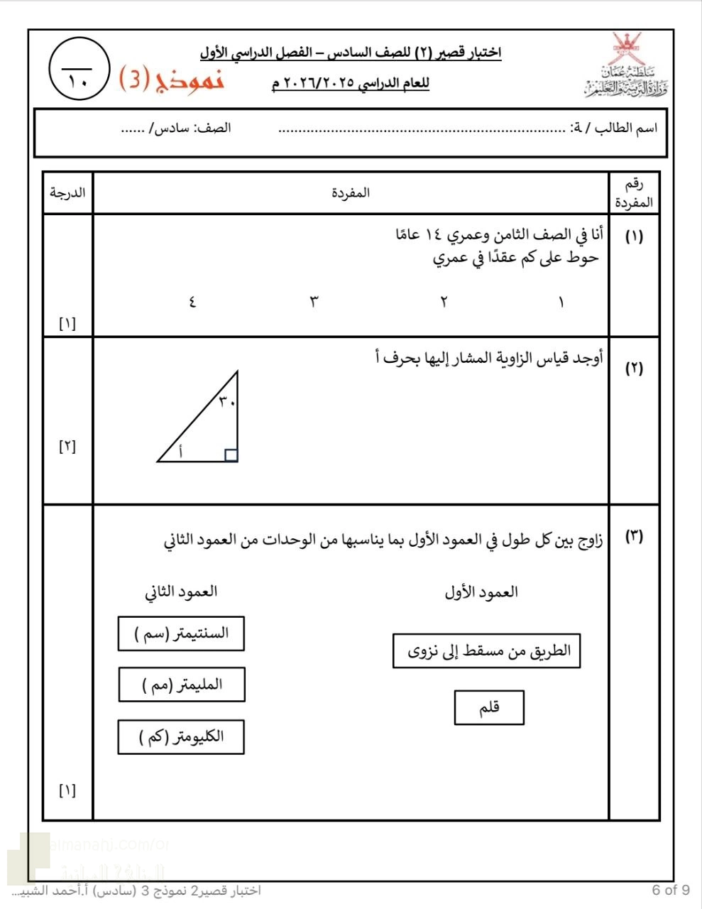6. رياضيات, الفصل الأول, 2025/2026, اختبار قصير ثاني نموذج (2) من أكاديمية همم التعليمية