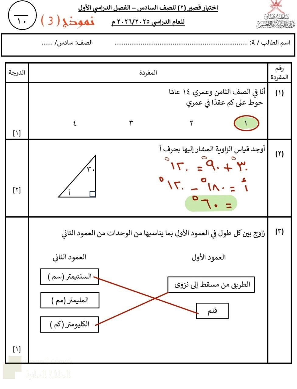 10. الصف السادس, رياضيات, اختبار قصير ثاني نموذج (3) من أكاديمية همم التعليمية