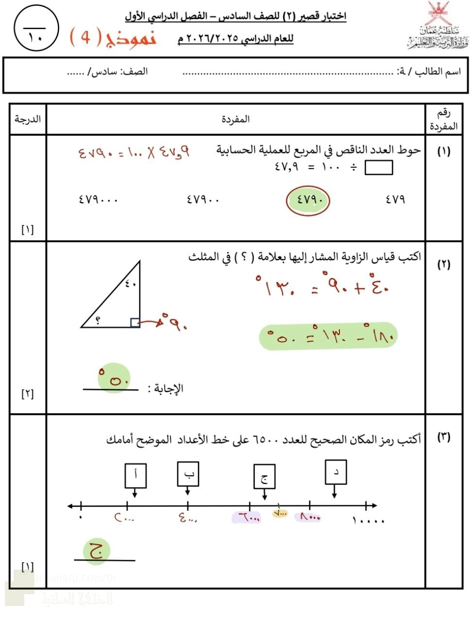 10. الصف السادس, رياضيات, اختبار قصير ثاني نموذج (3) من أكاديمية همم التعليمية